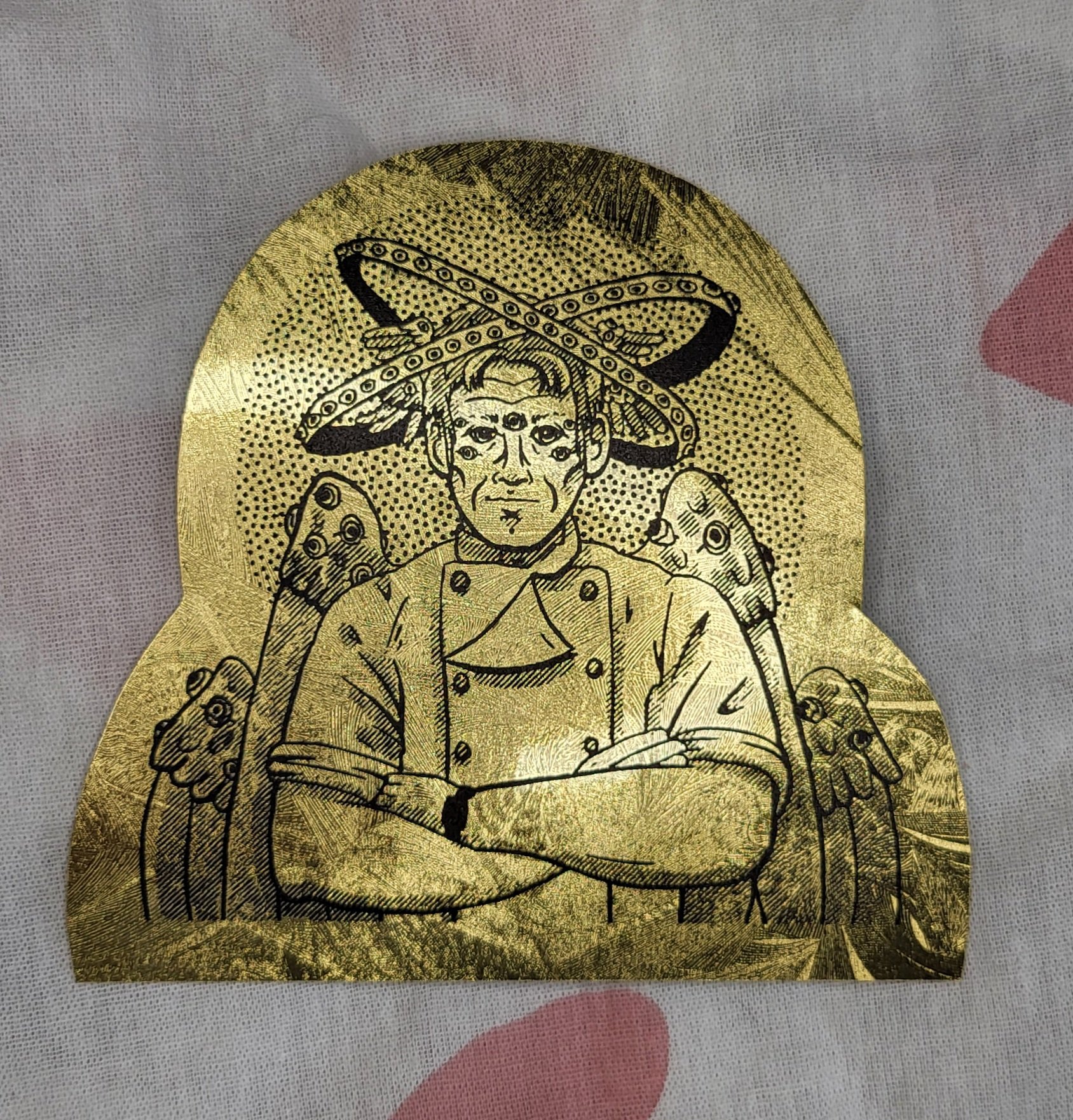 3" Vinyl Sticker of Biblically Accurate Gordon Ramsay. Printed on brushed gold vinyl. Includes freebies. No lamb sauce included.